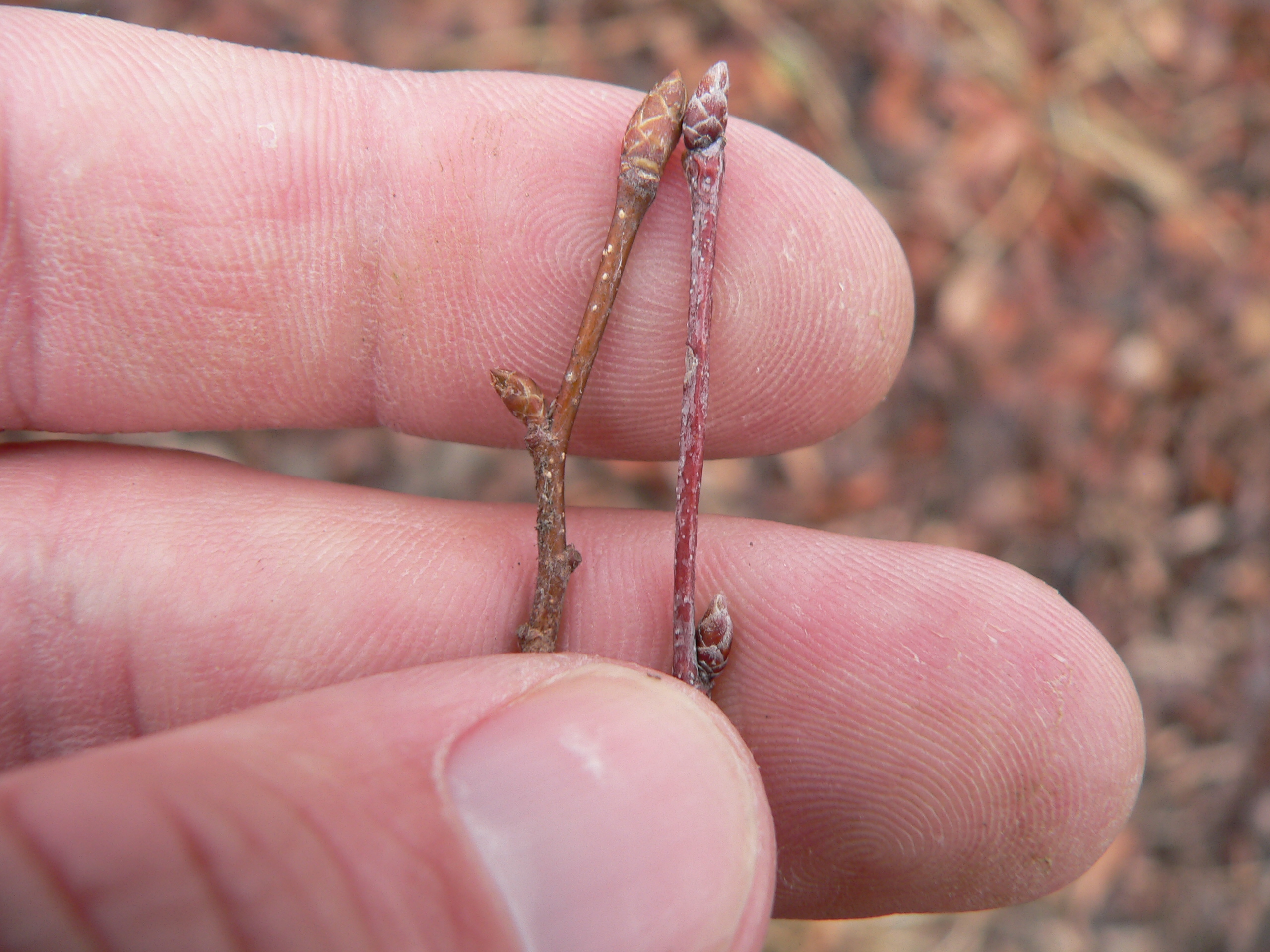 Ironwood (left) and Musclewood (right) twigs. Musclewood tends to be more reddish,